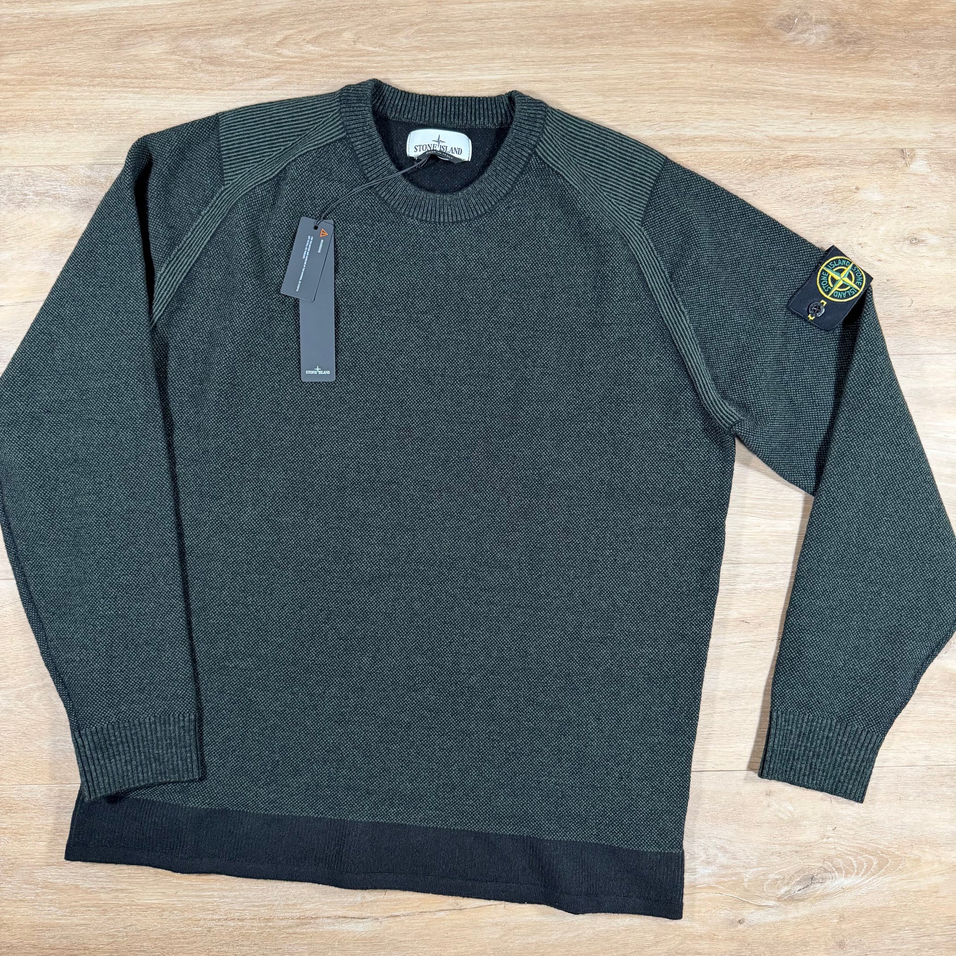 Stone Island Crewneck Knit Pullover crafted from two-tone blended yarns, knitted with a fine micro-stitched texture for depth and softness. Designed with raglan sleeves for a relaxed, ergonomic fit, it features ribbed detailing along the shoulders, cuffs, and hem. The look is finished with the iconic Stone Island badge on the left sleeve.