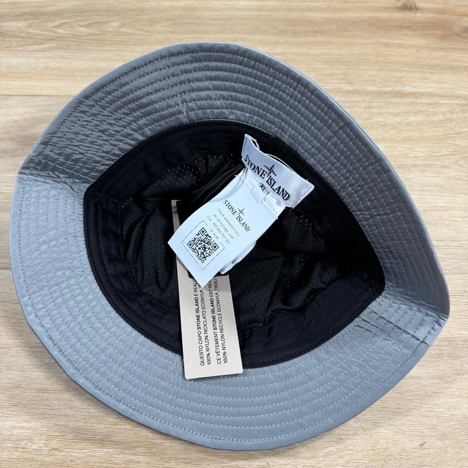 Bucket hat in iridescent Nylon Metal fabric made with ECONYL® regenerated yarns. Features raised embroidered Stone Island Compass logo on the front, cotton twill contour band, and mesh lining.
