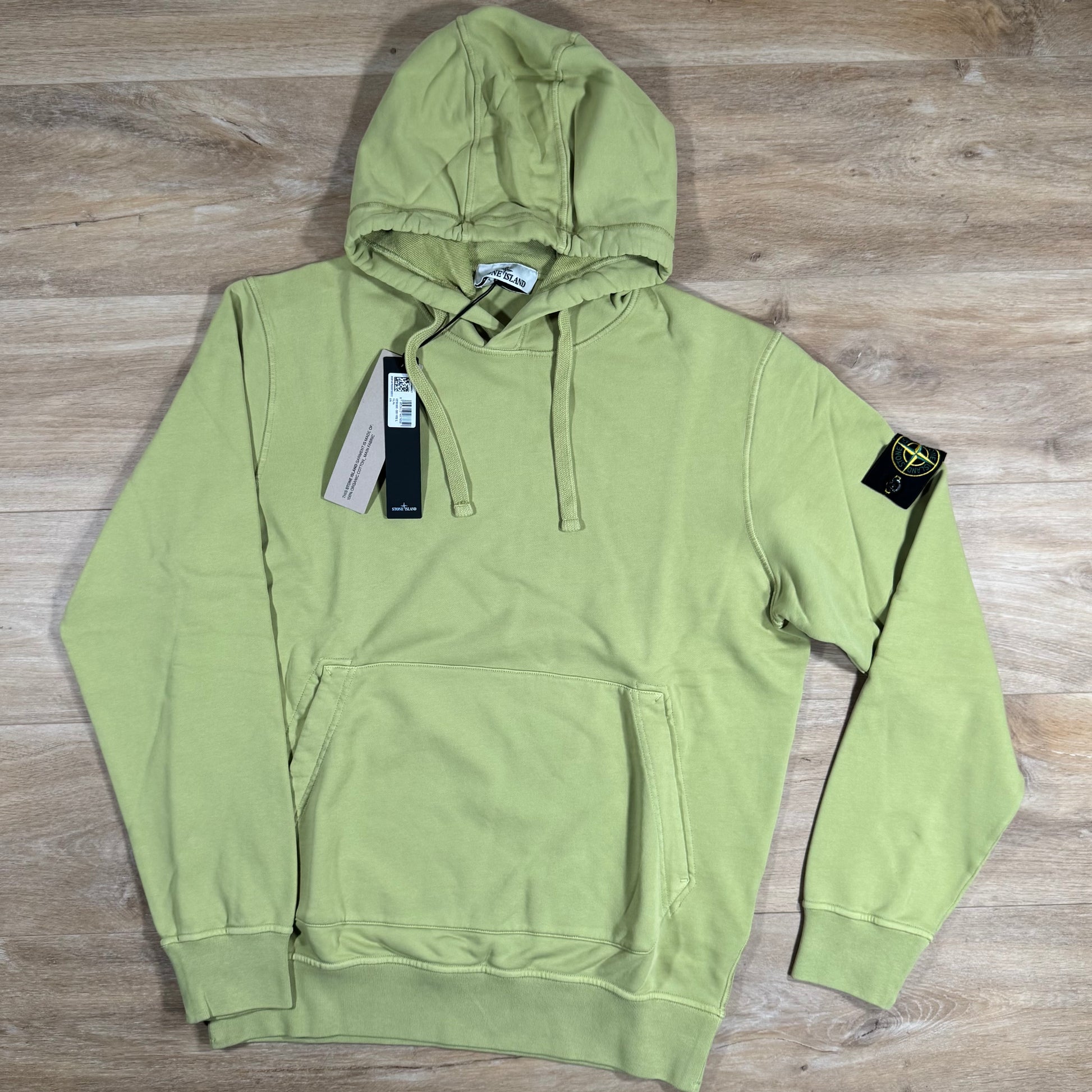 Hooded sweatshirt in organic cotton fleece, garment dyed for rich colour. Features a drawstring hood, overlock seams, and a pouch pocket with slanted entrances. Finished with the Stone Island badge on the left sleeve, a lunette detail under the back neckline, and ribbed cuffs and hem. Regular fit.