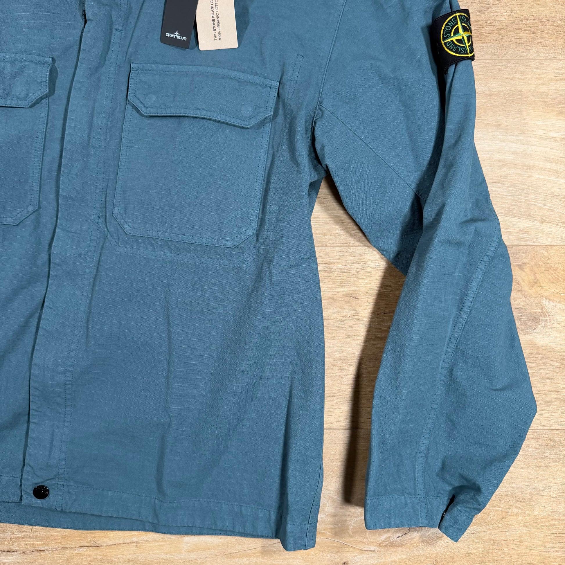 This overshirt is crafted from organic cotton ripstop and garment dyed for rich, nuanced colour. It features chest patch pockets with dual snaps under the flaps, a back yoke, tightening snaps at the cuffs, and the Stone Island badge on the left sleeve. The two-way zip fastening runs to the chest and is concealed beneath a placket secured with one snap at the bottom and two across the upper chest. Cut in a comfort fit.