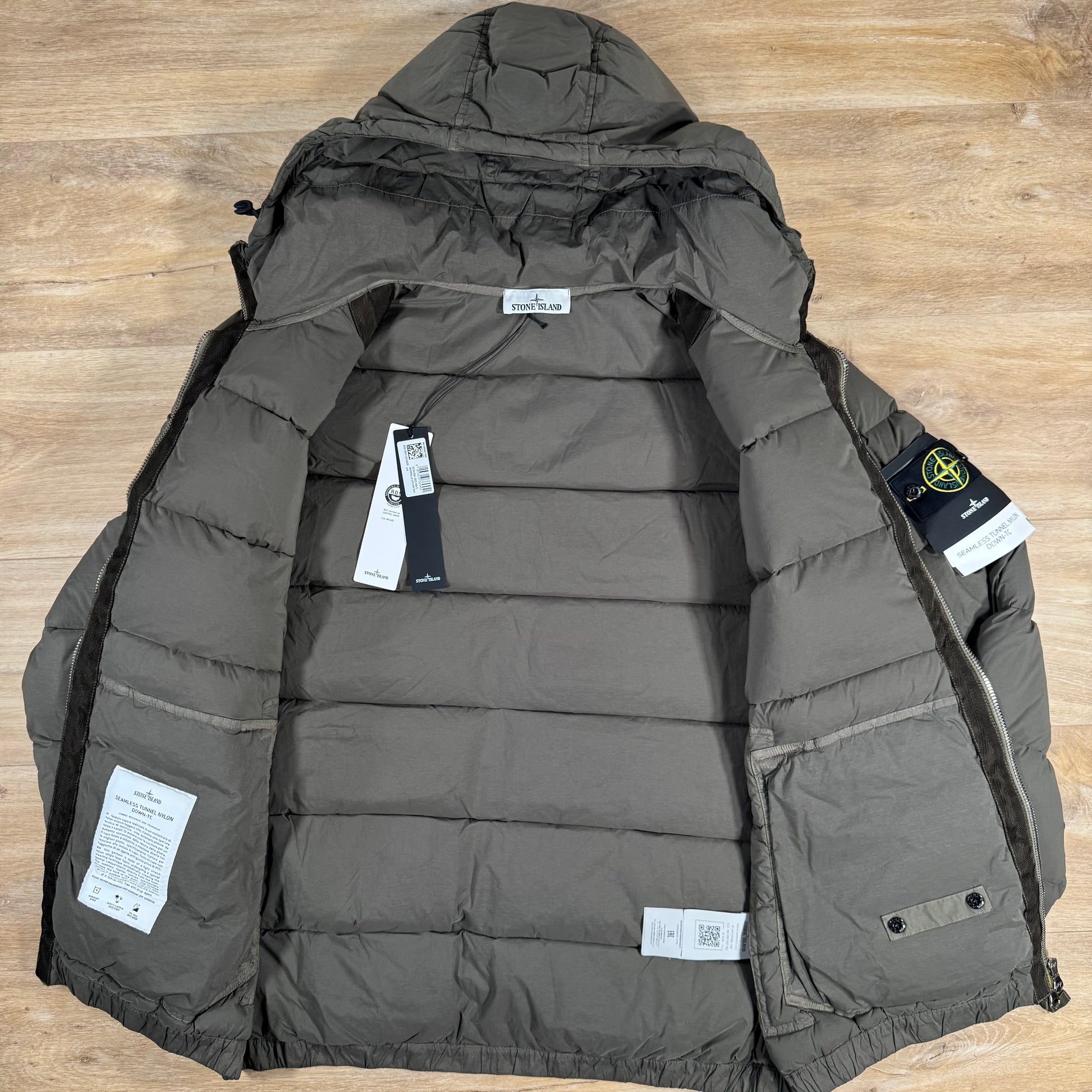 This Stone Island hooded down jacket is made from light stretch nylon single-layer fabric, woven using a special technique that creates the feather compartments directly on the loom. The seamless feather tunnels improve down stability, while direct injection of RDS-certified down—treated to withstand garment dyeing—ensures warmth and durability. Garment dyed with an anti-drop finish, it features a padded hood with horizontal and contour drawcords, standing hand pockets with contrast herringbone tape flaps and snaps, elasticated cuffs and hem, and the Stone Island badge on the left sleeve. Finished with a two-way zip fastening for functional versatility.