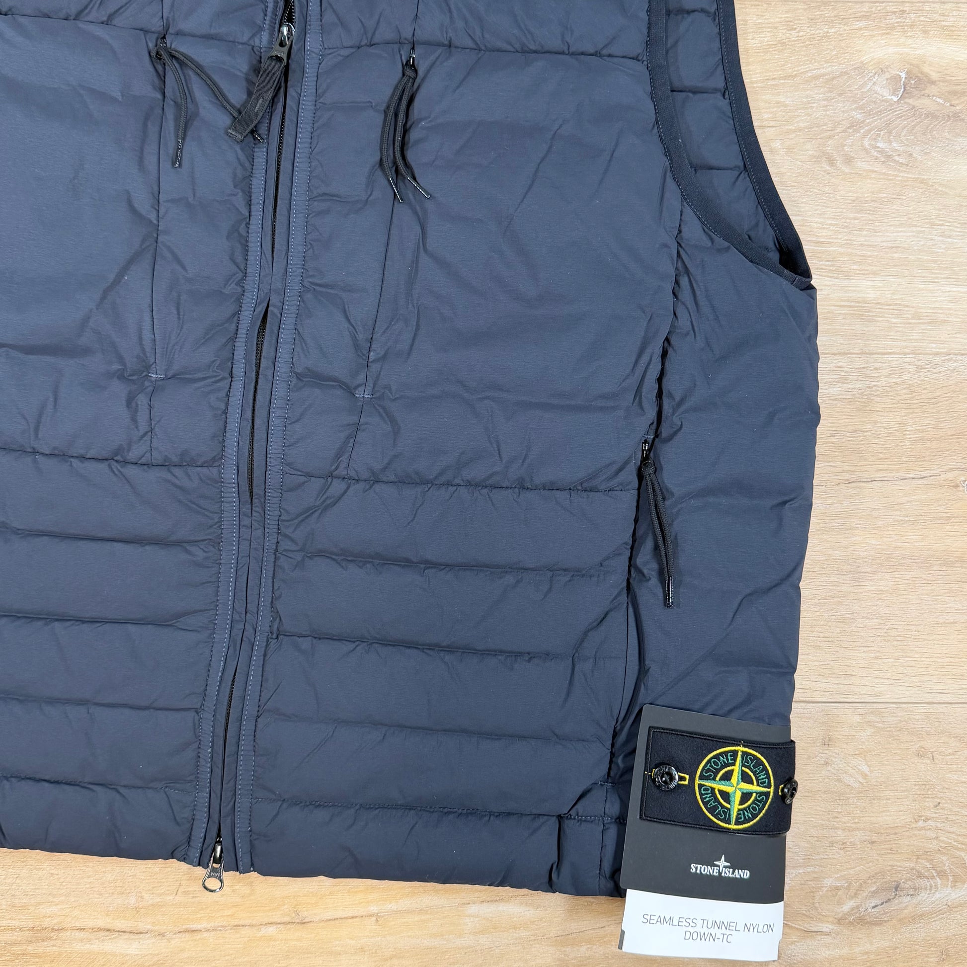 This Stone Island down vest is made from a light stretch nylon single-layer fabric produced with a special weaving technique that forms the feather compartments directly on the loom. The seamless feather tunnels enhance down stability, while direct injection of the finest feathers—treated to withstand garment dyeing—ensures lasting performance. It features a padded stand collar, standing chest and hand pockets with invisible zips, and elasticated tape trim at the armholes. Finished with a drawcord hem, the Stone Island badge on the lower left side, and a two-way zip fastening with an additional inner placket snap.